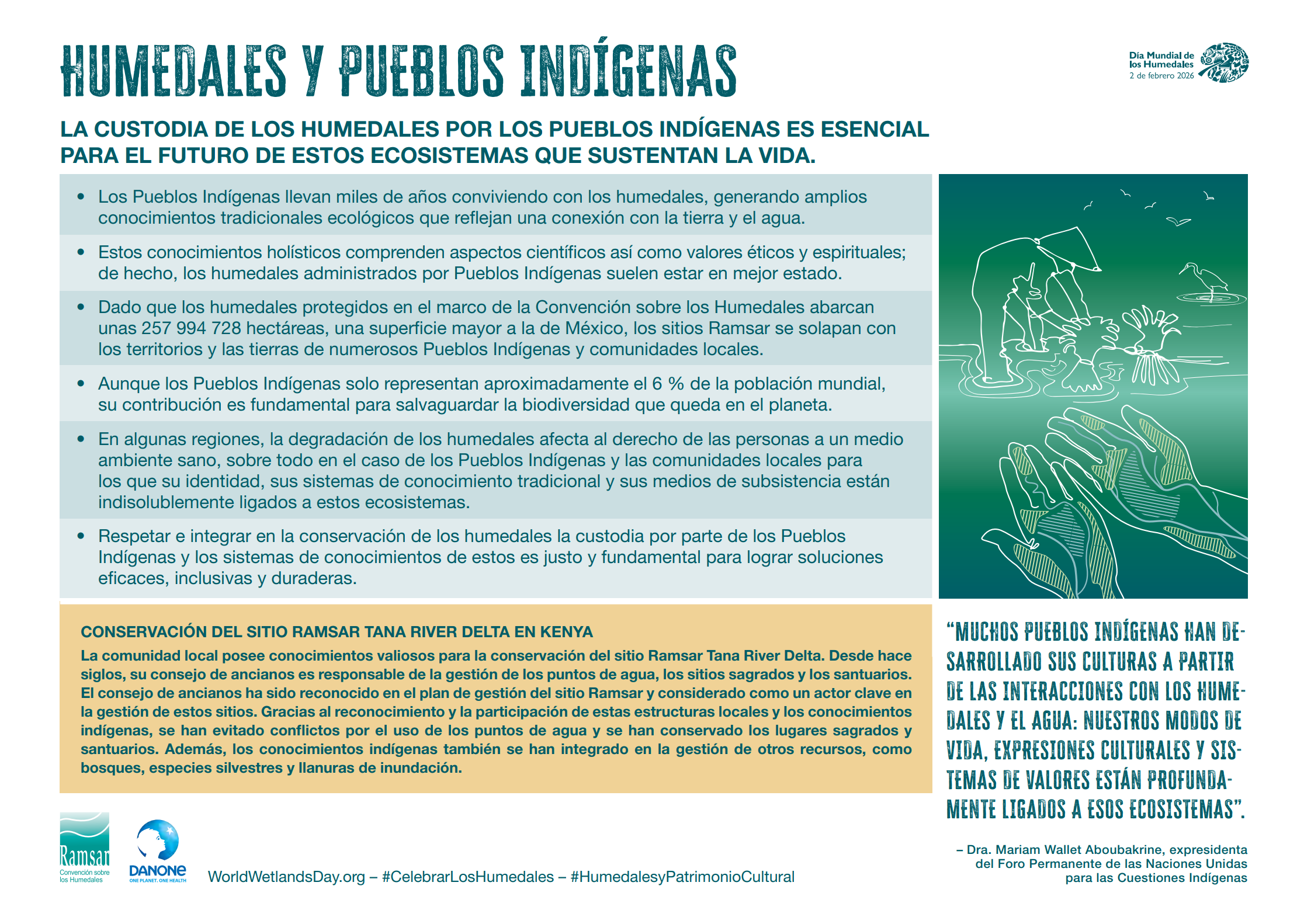 El Día Mundial de los Humedales, conmemorado cada 2 de febrero desde la firma de la Convención de Ramsar en 1971, tiene un tema oficial para 2026 centrado en “Los humedales y los conocimientos tradicionales: celebrar el patrimonio cultural”. Este enfoque reconoce que los saberes locales y ancestrales han sido fundamentales para proteger estos ecosistemas durante generaciones, y que su participación es clave para abordar desafíos actuales como el cambio climático y la degradación ambiental.