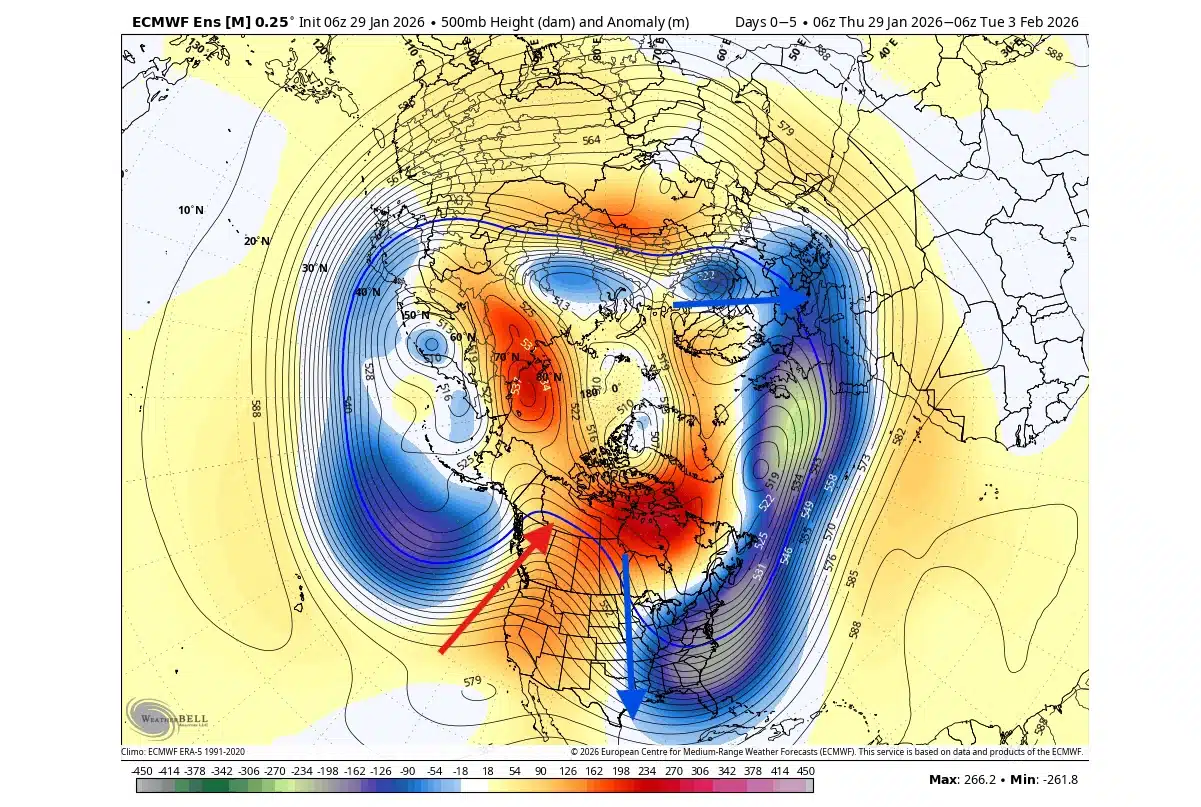 Ese viaje suele comenzar en el Ártico, atravesar Norteamérica y, en determinados inviernos, alcanzar México y Centroamérica y otras partes de Europa en forma de frentes fríos más intensos de lo normal.